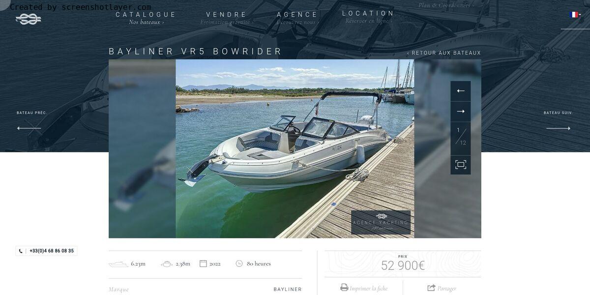 Découvrez le Bayliner VR5 2022, un bateau presque neuf équipé d'un moteur Mercury 150ch. Ce modèle de 6,23 mètres peut accueillir jusqu'à 9 personnes, offrant un design moderne et des finitions de haute qualité. Avec ses performances optimales, son confort exceptionnel, et ses équipements modernes, il est parfait pour toutes vos sorties nautiques. Profitez de son cockpit spacieux, de son tableau de bord avancé et de ses nombreux rangements. Ne manquez pas cette opportunité unique et contactez-nous dès aujourd'hui pour plus d'informations ou pour organiser une visite.