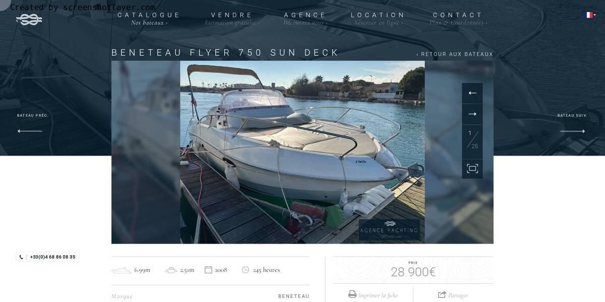 Découvrez ce Beneteau Flyer 750 Sundeck de 2008, présenté dans un état remarquable. Entretenu avec une grande minutie par ses propriétaires, il offre un excellent niveau de fiabilité et de confort. Sa carène performante, son cockpit spacieux et son large bain de soleil avant en font un bateau idéal pour les sorties en famille ou entre amis. Un modèle recherché, prêt à naviguer et à offrir de superbes moments en mer.