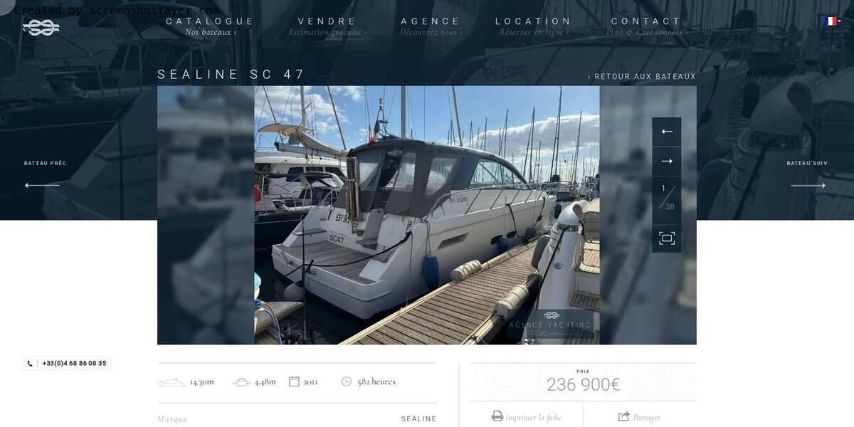 Découvrez ce magnifique SEALINE SC47 de 2011, version 3 cabines, première main, dans un état exceptionnel. L’intérieur, jamais utilisé, est comme neuf et offre un confort remarquable. Ce yacht est prêt à naviguer et dispose d’équipements haut de gamme : climatisation pour un confort optimal, générateur pour une autonomie prolongée, et une passerelle hydraulique pour un accès facilité à bord. Le bateau est également doté d’un hardtop ouvrant, d’un grand cockpit modulable et d’une cuisine entièrement équipée. Motorisation puissante et entretien irréprochable, c'est une occasion rare pour les amateurs de navigation.